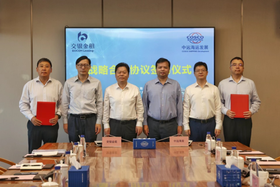 7月31日下午,交银金租与中远海发战略框架协议签约仪式在中远海运大楼成功举行。交通银行首席专家,交银金租党委书记、董事长徐斌,中远海发党委书记、董事长刘冲出席签约仪式并致辞。交银金租党委副书记、总裁竺叶群,中远海发党委副书记、总经理张铭文出席并见证签约仪式。交银金租党委委员、副总裁王东,中远海发副总经理明东代表双方签约。签约前,双方就未来深化合作、互利共赢进行了深入探讨与交流,并一同参观了中远海运集团展厅,共同了解和回顾了中远海运集团的发展历程。